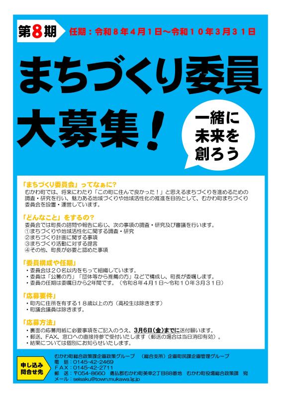 現在活動中の第7期まちづくり委員会委員の任期が令和8年3月31日で満了となることから、新たに第8期まちづくり委員会委員を公募します。