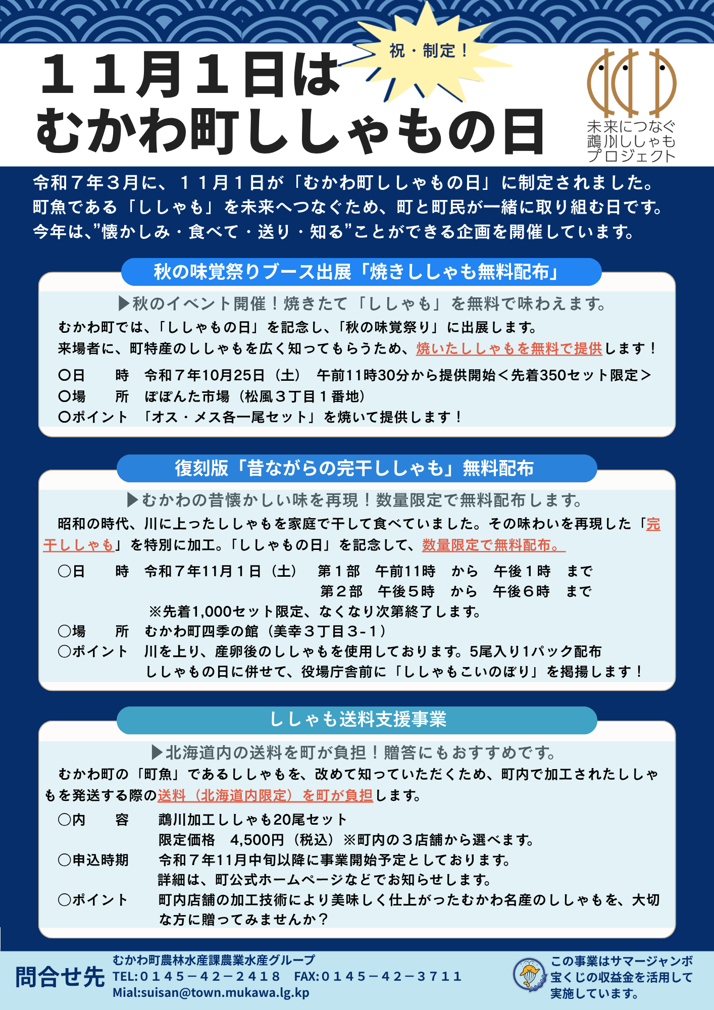 令和7年3月に、11月1日が「むかわ町ししゃもの日」に制定されました。