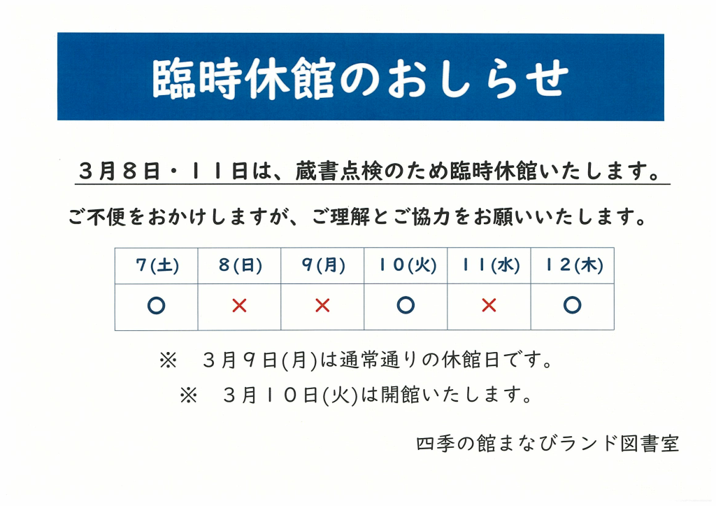 ※3月9日(月)については通常の休館日となります。